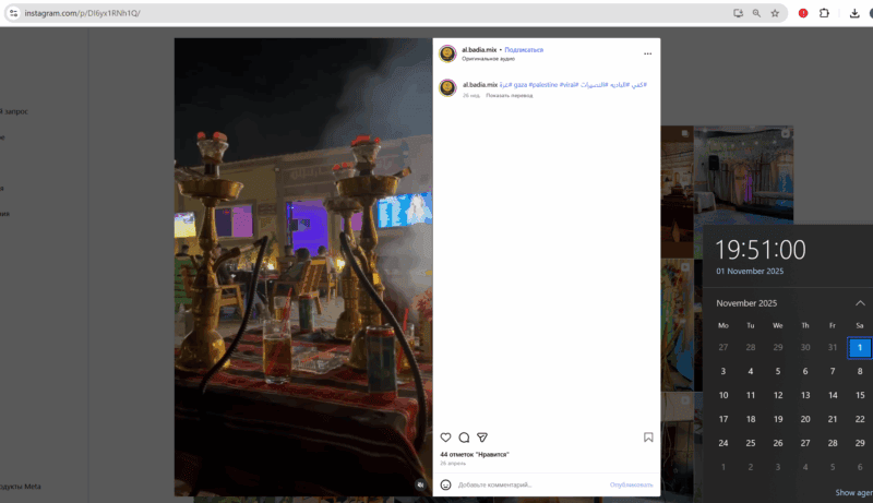 Судя по датам публикаций, кафе было закрыто с начала войны и снова открыто в конце декабря 2024. На дату этой публикации (01.11.25) продолжает работать. Здесь представлены скриншоты только записей периода войны в Газе. Для удобства поиска этой публикации присвоена дата 26.04.25.