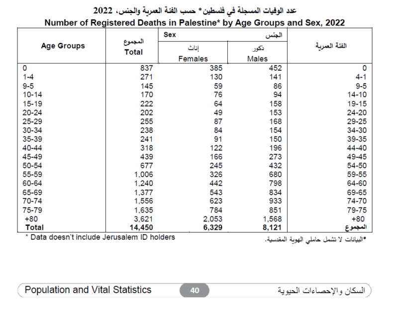 Палестинское статистическое бюро (данные о довоенной смертности): 2018 — 5225 чел., 2019 — 5106, 2020 — 5552 чел., 2021 — 6970 чел. , 2022 — 5574 чел. После 2023 — данные отсутствуют. (Сайт не открывается из Израиля)