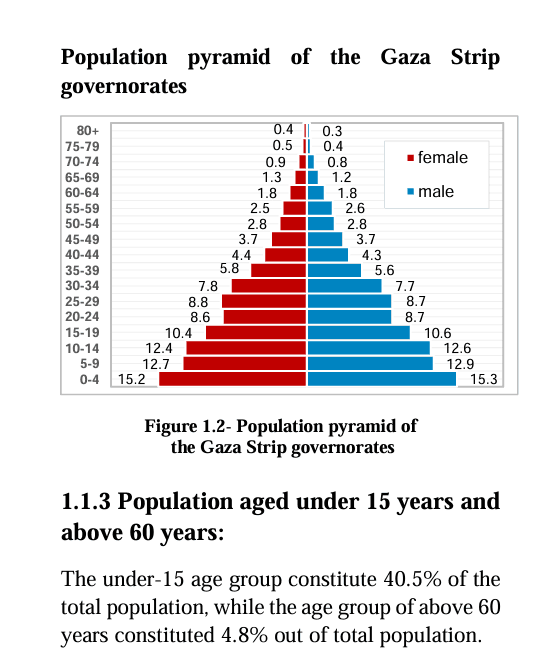 Согласно отчету палестинского статистического бюро за 2022 год доля людей старше 60 лет, которые умерли в Газе и на Западном берегу (Иудея и Самария) в 2022 году, составляет 65% от общего числа смертей. https://www.pcbs.gov.ps/Downloads/book2688.pdf (см. таблицу на стр. 40 отчета)