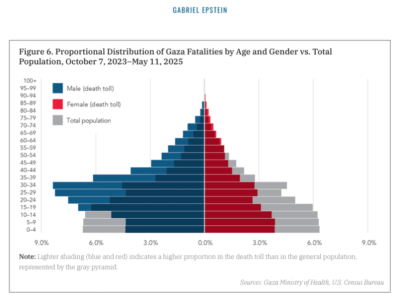 В отчете Института WINEP (авторство Габриэля Эпштейна) за май 2025 приведено детальное распределение статистики погибших по полу и возрасту в сравнении с общей статистикой населения.