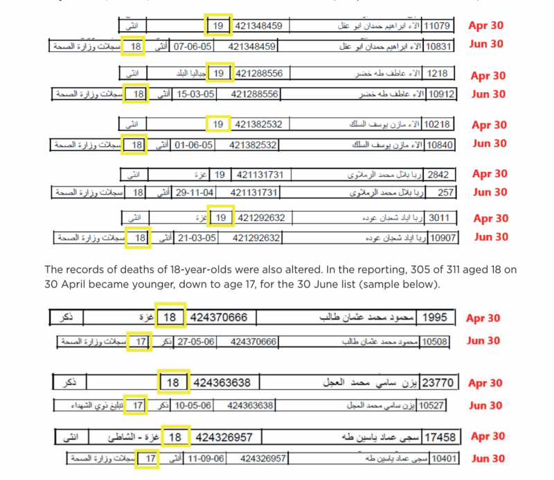 Сравнение первых 1000 имен в списках за октябрь 2023 года и июль 2024 года выявило несколько несоответствий в данных, в том числе исчезновение восьми человек между списками, дубликат в октябрьском списке и, что наиболее важно, более 100 человек, возраст которых был уменьшен на один год между октябрьским и июльским списками. Данные о смертности среди детей играют важную роль в освещении этой войны, но закономерность несоответствий в возрасте между списками ставит под сомнение эти цифры.